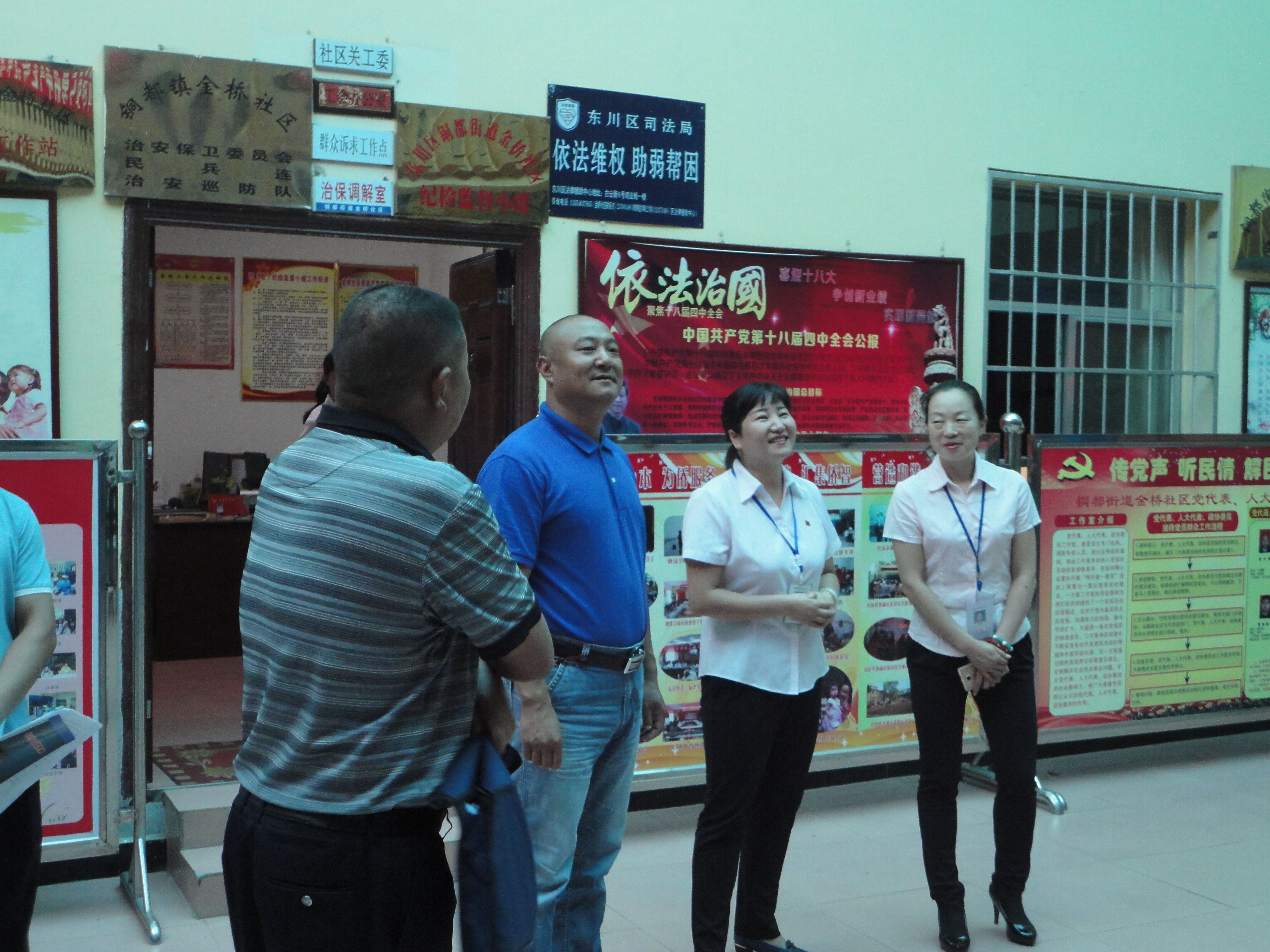2015年7月14日,东川区委常委、区委政法委书记都吉在刘波副书记、办公室主任周荣、综治办副主任杨德忠、铜都街道办事处政法副书记肖朝能等人的陪同下,先后来到金桥社区、矛调中心、区信访局走访调研基层政法综治维稳工作。