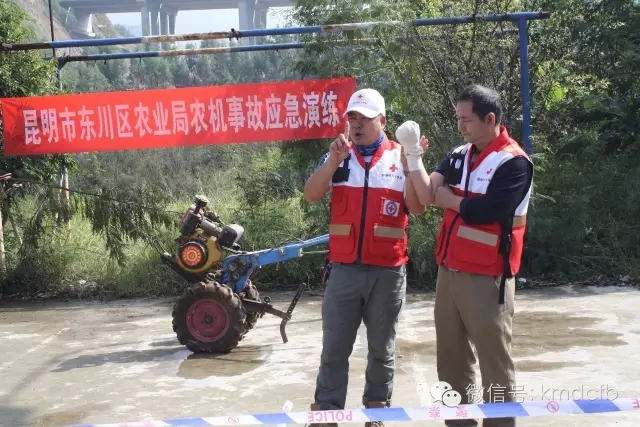 演习模拟事故为一名微耕机操作手在使用微耕机犁地的过程中,出现意外,造成脚骨受伤,伤势严重,于是报警求助。东川区农机监理所监理人员到达现场后,立即对现场进行警戒、拍照,同时组织人员把伤员从拖拉机下抬出,进行包扎,保护事故现场,等待120急救。区农机安全监理所工作人员到达后,进行事故调查。整个演习开展严格按照预案进行,各部门职责清晰,行动迅速,上下联动,相互配合,卓有成效。