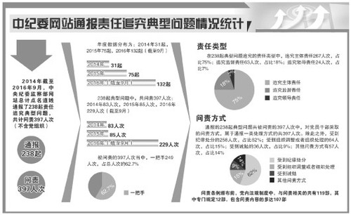 这只是中央纪委监察部网站通报的最新一起责任追究典型问题。根据该网站发布的统计数据显示,2014年以来,截至2016年9月,总计点名道姓通报了238起责任追究典型问题,共计问责397人次(不含党组织)。