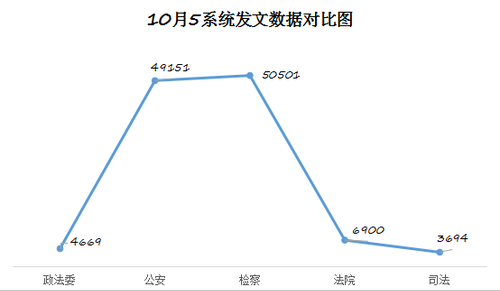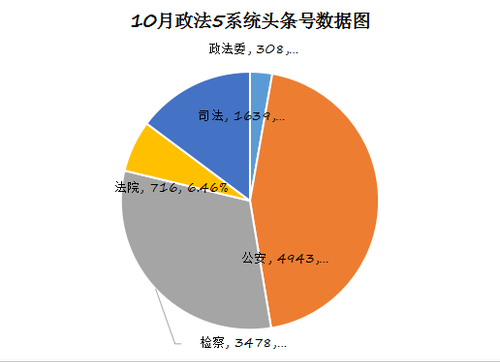 本报告统计了政法系统内政法委、公安、法院、检察院、司法5大系统头条号10月份数据,政法系统发文头条号为4,984个,较上月增长了135个头条号,环比增长2.78%。发文总数为114,915篇,较上月增长了5,786篇,环比增长5.30%。各系统具体数据如下图: