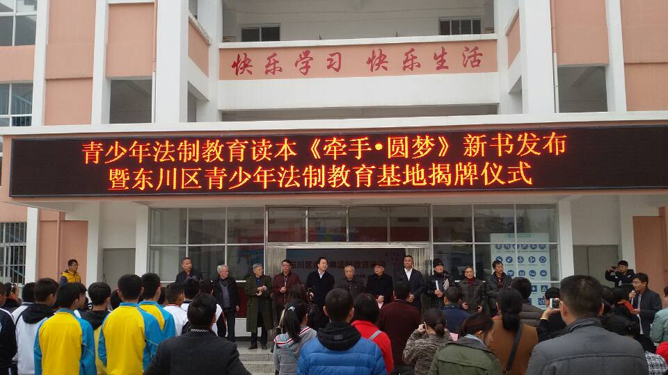 在第三个“国家宪法日”系列宣传活动之际,12月7日,东川区举行“青少年法制教育读本《牵手•圆梦》新书发布暨东川区青少年法制教育基地揭牌仪式”,市关工委副主任杨孝文、区委副书记欧明锋、区委政法委书记都吉、区委政协副主席邹康、团区委及区关工委有关领导出席仪式,并向到会现场的嘉宾和学生代表赠送了法制教育读本《牵手•圆梦》一书。