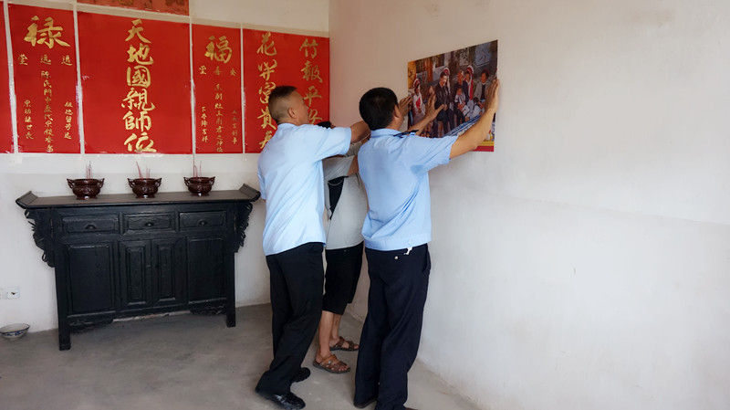 毕建华院长与帮扶干部、村组干部、党员代表及贫困户代表重温《入党誓词》,举行升国旗、唱国歌仪式,齐唱《没有共产党就没有新中国》,与村民签订《村规民约》。随后,毕建华院长走进结对帮扶的贫困户李扑仓、陈保宽家中,张贴习近平总书记工作照、东川区脱贫攻坚“一口清”贴画。与老人共同回顾党的光辉历程,讴歌党的丰功伟绩;为老人宣传“脱贫攻坚”政策,树立脱贫致富的信心和希望。最后,毕建华院长详细询问了老人的生活起居、身体健康情况,与群众交心谈心,同吃一顿亲情饭。