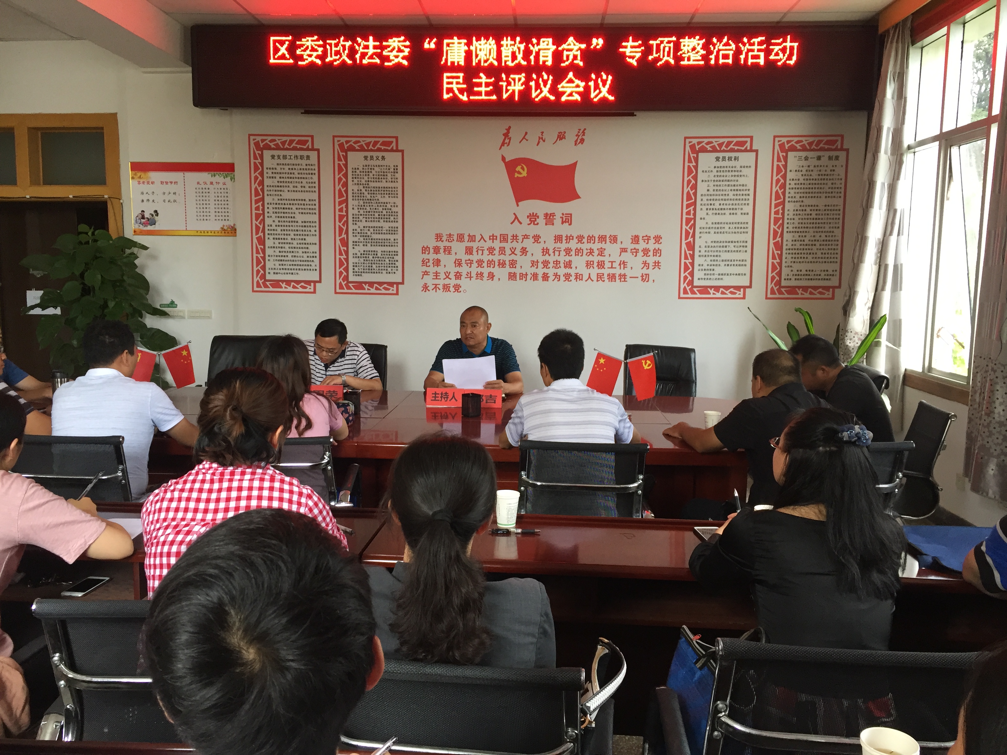 8月6日,东川区委政法委召开“庸懒散滑贪”专项整治活动民主评议会,对科级以上领导干部和一般干部进行评议,东川区委第五督导组到会指导。