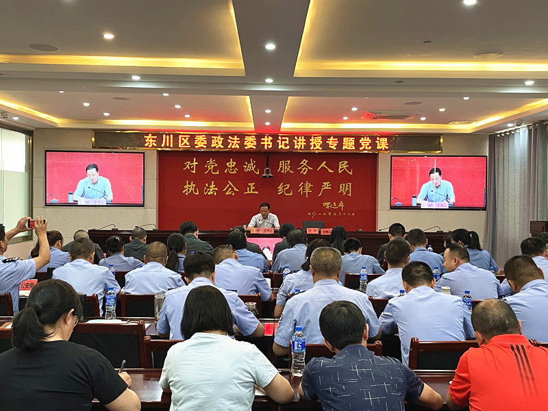 古鹏书记围绕 “十一个坚持”给大家阐述了习近平法治思想的核心要义,对《中国共产党政法工作条例》出台的背景,重大意义,遵循原则,主要内容,规定职责以及贯彻落实等方面进行了讲述,并就抓实抓好全区政法队伍教育整顿锻造新时代高素质的东川政法铁军提出了要求:要坚定理想信念、坚定党的领导、坚定人民立场、坚定责任担当、坚定廉洁本色。